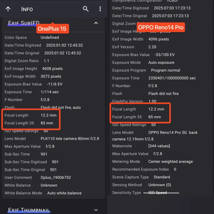Аналіз метаданих показав, що реальна фокусна відстань становить 12,2 мм із кроп-фактором 6,9X — ідентичним тому, що використовується в OPPO Reno14 Pro. Це підтверджує, що обидва пристрої базуються на одному сенсорі. Крім того, виявилося, що смартфони застосовують цифрове обрізання зображення з 80 мм до 85 мм, що відповідає фактичному коефіцієнту 6,6X для сенсора Samsung JN5.