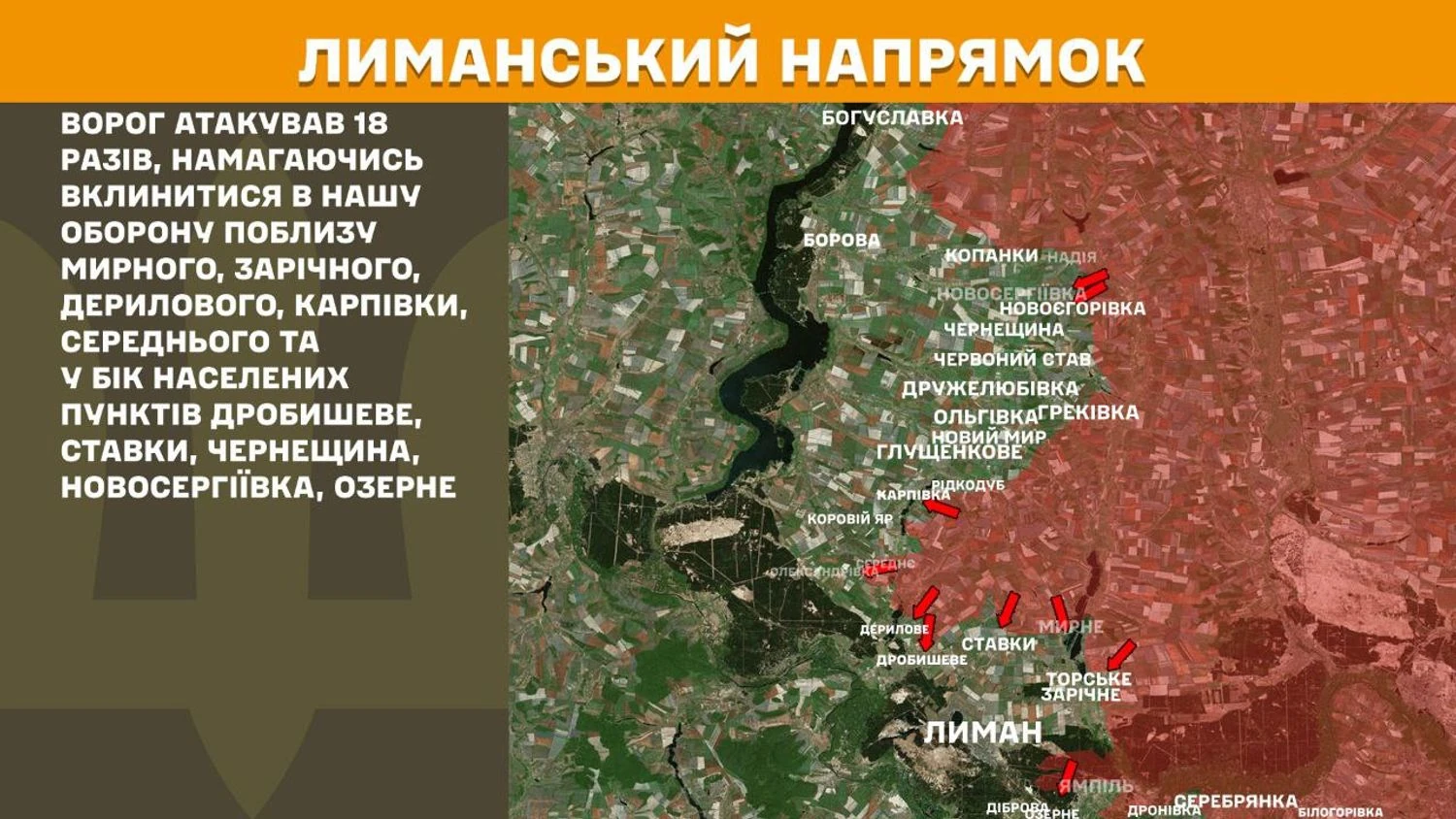 На Лиманському напрямку ворог атакував 18 разів, намагаючись вклинитися в нашу оборону поблизу Мирного, Зарічного, Дерилового, Карпівки, Середнього та у бік населених пунктів Дробишеве, Ставки, Чернещина, Новосергіївка, Озерне.