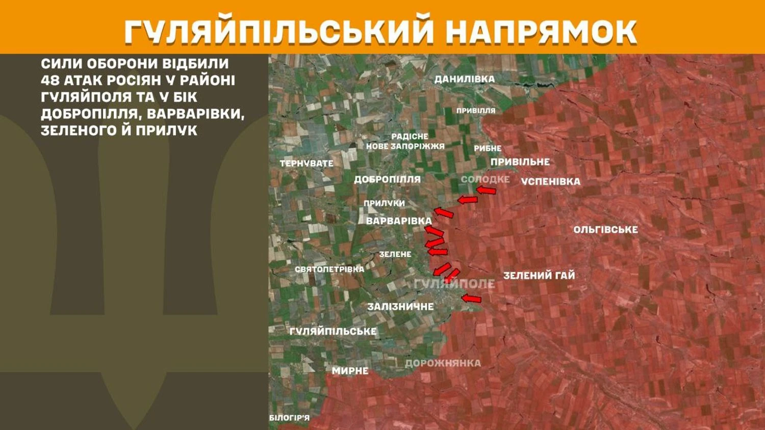 На Гуляйпільському напрямку Сили оборони відбили 48 атак росіян у районі Гуляйполя та у бік Добропілля, Варварівки, Зеленого й Прилук.