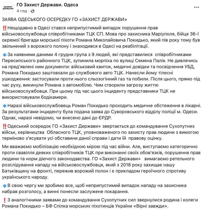 Работники Одесского ТЦК и СП избили бойца 36-й отдельной бригады морской пехоты, защитника Мариуполя Романа Покидько, которого всего полгода назад освободили из российского плена.