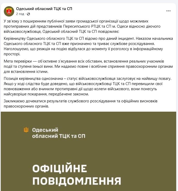 В свою очередь в Одесском областном ТЦК и СП заявили, что "начали служебное расследование".