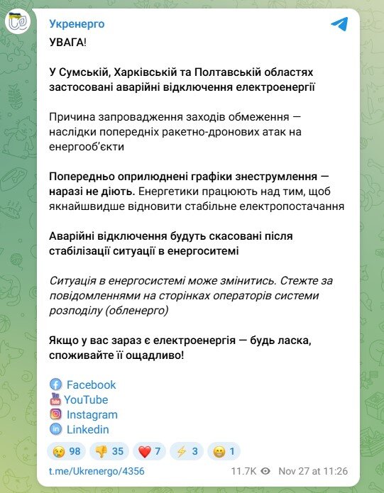 В четверг, 27 ноября, в трех областях Украины применены аварийные отключения электроэнергии.