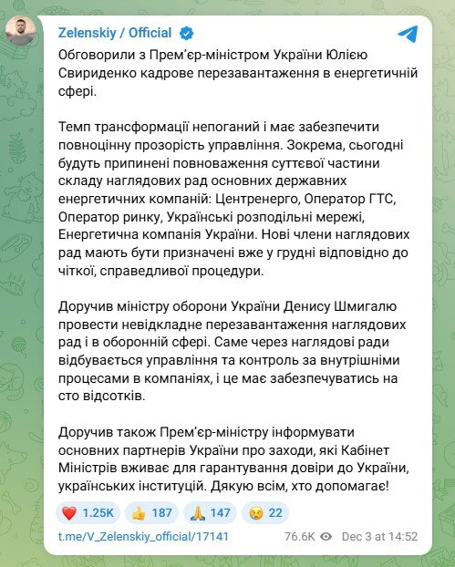 По словам Зеленского, в среду, 3 декабря, будут прекращены полномочия существенной части состава наблюдательных советов основных государственных энергетических компаний: Центрэнерго, Оператор ГТС, Оператор рынка, Украинские распределительные сети, Энергетическая компания Украины.